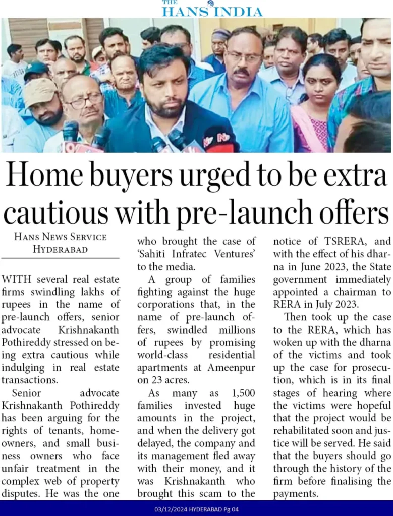 నా మీద ఇంత మంచి ఆర్టికల్ రాసిన హన్స్ ఇండియా ఇంగ్లీష్ పేపర్ వారికి నా హృదయపూర్వక కృతజ్ఞతలు🙏.. తెలుగు రాష్ట్రాల్లో ముఖ్యంగా హైదరాబాద్లో జరుగుతున్న రియల్ ఎస్టేట్ మోసాల్లో కొత్తగా ఇల్లు కొనుక్కునే వారు ఎంతో అప్రమత్తంగా ఉండాలి. దయచేసి ఆర్టికల్ చదవండి అప్రమత్తంగా ఉండండి... బి అవేర్ బి సేఫ్👍 Thank You "Hans India" for covering this article on me..Humbled🙏..This should be a good Precautionary to many new homebuyers in Hyderabad and both Telugu states...plz be aware and be safe🙏